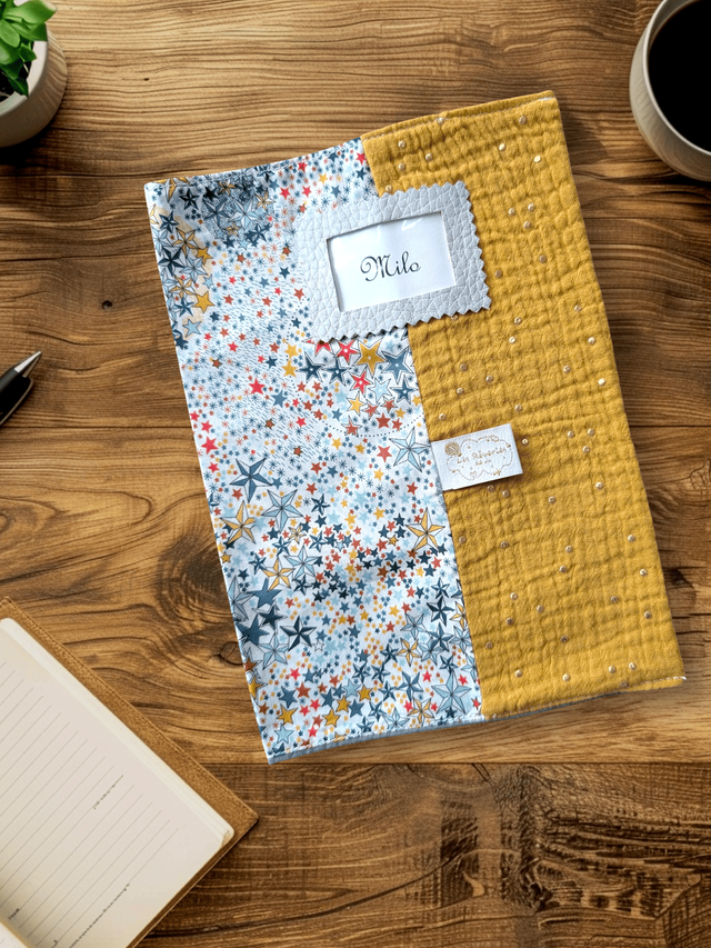 La face avant est habillée d’un simili cuir gris et d’un film plastique transparent, vous permettant d’y glisser une étiquette personnalisée avec le prénom de votre enfant ✨