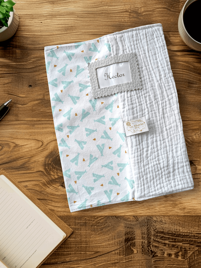 La face avant est habillée d’un simili cuir gris et d’un film plastique transparent, vous permettant d’y glisser une étiquette personnalisée avec le prénom de votre enfant ✨